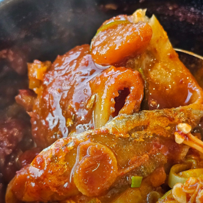 갈치조림 완전 처음 보는 스타일이에요. 가시 발라서 꼬불 오 뎅처럼 꼬치에 끼워 있는데 보는 재미도 있고 살도 엄청 부드러워요.