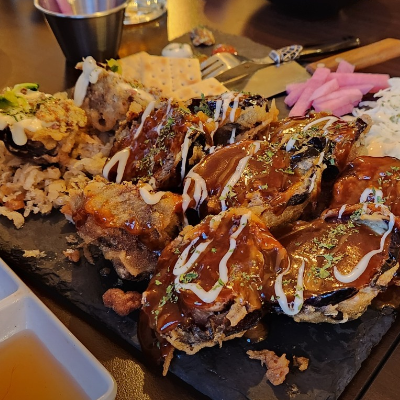 유쾌한 사장님이 개발한 여러가지 가지요리가 하이볼과 천상궁합이예요. 가끔 배달로도 먹는데 가성비 굿입니다.