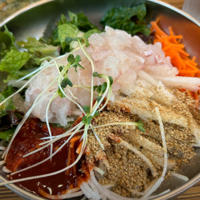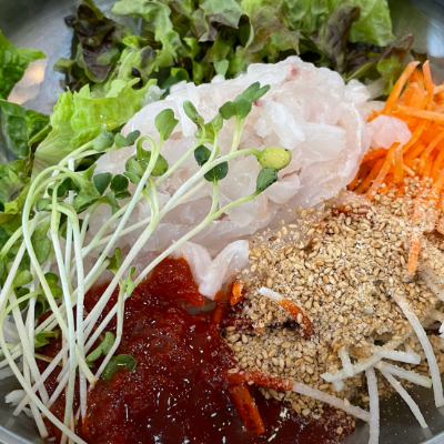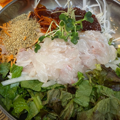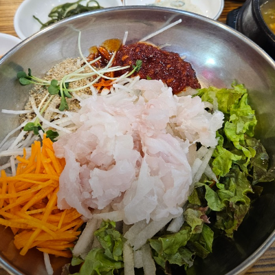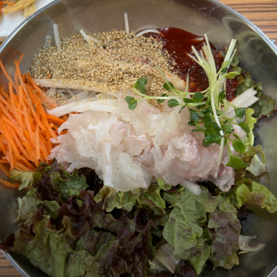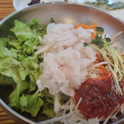 고소하게 회덮밥으로 먹다가 물회로도 먹을수있어요 밑반찬 너무 맛있구요휴가간김에 친구가 맛있다고 대려갔는데 배가 많이 들어가서 아삭아삭 식감이 좋고 부드러워요.