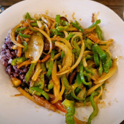 요일 메뉴가 있길래 시켜봤는데 두부 탱글탱글하고 소스가 녹진한게 맛있네요. 맵거나 하진 않고 밥이 흑미밥이 나온게 재밌네요.