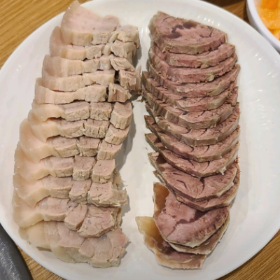 냉제육의 돼지고기,지방층 레이어가 잘 나뉘어있어 맛의 질감과 씹힘이 다양하 고 끝 부분 껍질도 꼬독꼬독합니다.