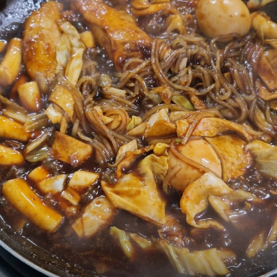 춘장베이스에 즉석떡볶이입니다. 맵게 해달라고 하면 맵게도 가능! 맛있게 매운맛입니다.