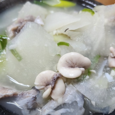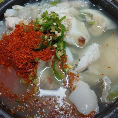 국물을 한 숟갈 마셔보면 담백한 맛에 마늘향이 납니다. 해장에 딱인 국물이었어요. 잡내가 전혀 없는 깔끔한 맛이에요.