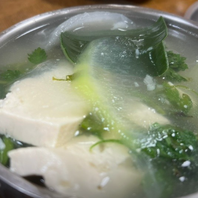 국물을 한 숟갈 마셔보면 담백한 맛에 마늘향이 납니다. 해장에 딱인 국물이었어요. 잡내가 전혀 없는 깔끔한 맛이에요.
