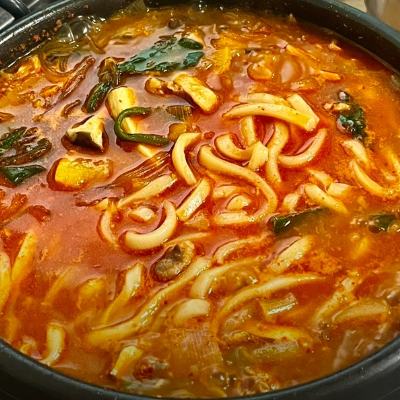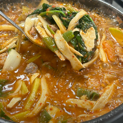 곱창전골에 당면이 기본 들어 있구요. 추가도 가능해용. 고추장찌개 같이 국물이 진해요~ 감자도 들어 있어요.