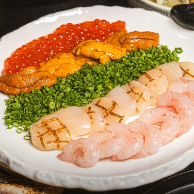 우니한판은 연어알, 성게, 쪽파, 관자, 새우가 모두 들어간 이 메뉴는 바다의 풍미를 한번에 느낄 수 있어요.