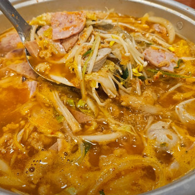 수제햄으로 만든 부대찌깨! 얼큰하고 담백하고 건강한 맛입니다.