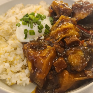 100% 식물성 단백질로 만든 대체육과 건강에 좋은 가지를 올려 수란과 함께 먹는 덮밥