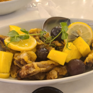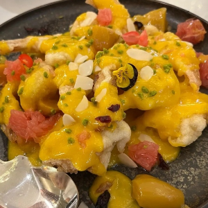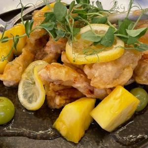바삭하게 튀긴 새우에 애플 망고와 칙피(병아리콩) 망고 소스를 얹은 요리