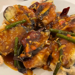두툼한 가지 사이에 다진 새우와 통새우를 함께 넣어 튀겨낸 겉바속촉 새우 요리