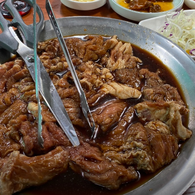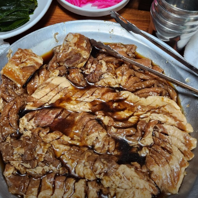 갈비 부드럽고 간두 적당합니다. 스텐불판에 구워 육장에 찍어먹는 옛날돼지갈비맛 그대로입니다.