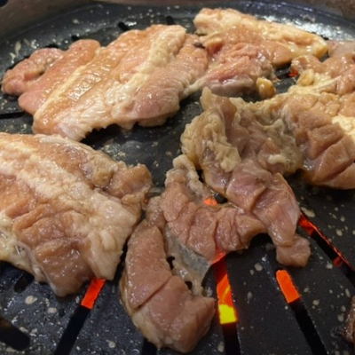 참숯으로 굽는 곳이라 고기 구워지는 향기가 대박입니다. 한 번에 다 구워서 먹는 대식가 저희 자매 삼겹살 이렇게 둘러놓으니 침샘이 두 배 폭발했어요.