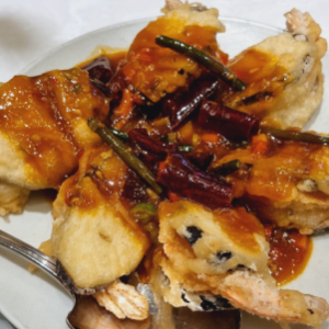 두툼한 가지 사이에 다진 새우와 통새우를 함께 넣어 튀겨낸 겉바속촉 새우 요리