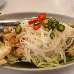 바삭하게 튀긴 중국 치킨 유린기에 그린 파파야를 더해 동남아풍으로 완성한 요리