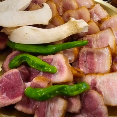 고기를 소금에 살짝 찍어 생강채를 올려먹거나 명이나물에 와사비 살짝 올려 먹거나 파김치에 올려먹어도 고기와 밑반찬도 엄지척입니다.