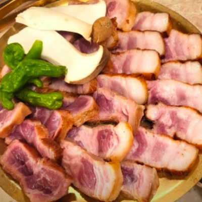 여기는요 고기를 구워주셔요 그래서 좋았네요. 품질 좋은 최고돈육을 사용하여 초벌을 해서 나와서 약한불로 조금씩 이렇게 구워서 먹어요.