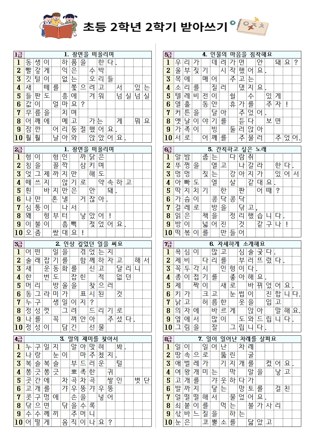 오늘은 받아쓰기 자료를 가지고 왔습니다. 초등 2학년 2학기 받아쓰기 급수표 다운로드 자료 입니다.