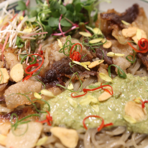 담백한 뽕잎 메밀면에 고소한 들기름이 어울어 비빔면이예요. 진한 양념이 베인 전라도식 육회비빔면도 맛있어요.