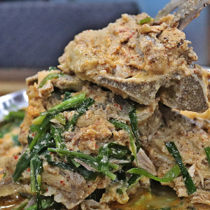 큼직한 뼈가 가득한 감자탕에 부추도 잔뜩 들어가고 고소한 초당콩과도 잘 어울려요.