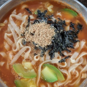 옹심이장칼국수 맛있어요. 매콤한 국물에 쫄깃한 옹심이예요.