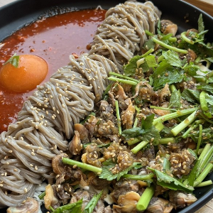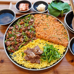 양념이 매콤하고 막국수에 홍시가 들어간 게 신기한 맛이네요. 김에 싸먹으면 더 맛있어요.