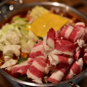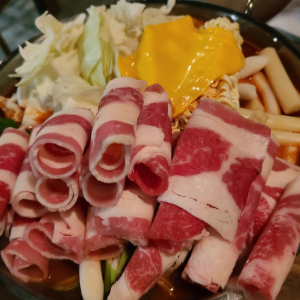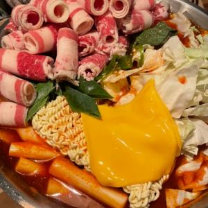 매콤달달한 떡볶이와 고소한 차돌박이가 들어 있습니다.
