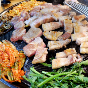 고기를 솥뚜껑으로 구워먹는다는게 특이하고 지글지글 익어가는 고기 쳐다보고 있으면 침이 고여요.