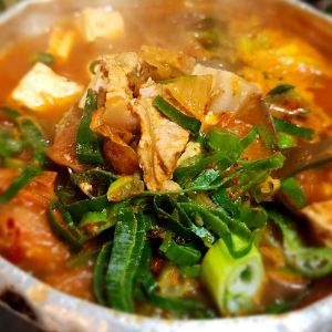 사골로 육수를내어 숙성된 김치와 제주산흑돼지앞다리살을 넣어 끓인 인기좋은 김치찌개입니다.