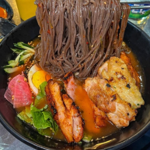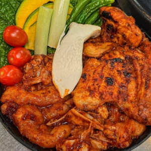 숯불에 구운 닭갈비와 찰떡궁합인 매콤달콤한 비법막국수로 구성되어 있습니다.