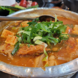 사골로 육수를내어 숙성된 김치와 제주산흑돼지앞다리살을 넣어 끓인 인기좋은 김치찌개입니다.