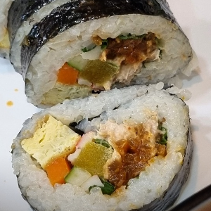 참치김밥이랑 매운우엉김밥 먹었는데 맛이 좋았어요. 한줄만 먹어도 든든했어요.