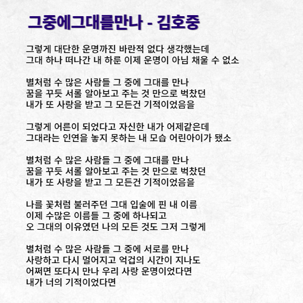 김호중이 부른 그 중에 그대를 만나는 김이나 작사, 박근태 작곡의 노래로 지난 2014년 가수 이선희의 30주년 기념 앨범 타이틀곡이기도 합니다. 이번 OST 수록을 위해 김호중의 목소리로 리메이크 되었습니다. 원곡의 감동을 어떻게 재해석하여 불렀을지 많은 분들이 관심이 쏟아지고 있습니다.