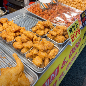 시장에 간다면 당연히 닭강정 먹어줘야죠. 양도 많고 달짝지근한 양념도 좋습니다.