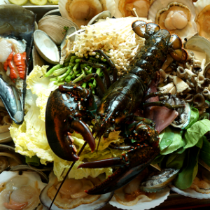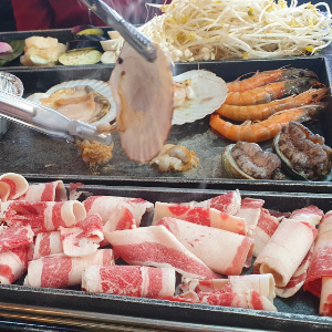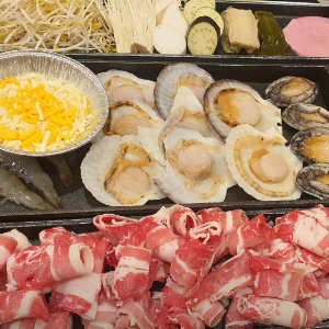 전복, 가리비, 새우, 관자, 고기, 문어, 치즈, 버섯 등 고기와 해산물을 동시에 먹을 수 있습니다.