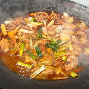 솥뚜껑에서 팔팔 끓는 닭볶음탕은 보는것만으로도 맛있어 보입니다. 일단 눈으로 먼저 먹고 입으로 먹어보니 그 맛이 아주 굿입니다.