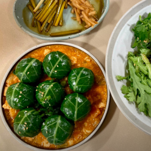 강된장 쌈밥은 케일로 싼 비주얼에 먼저 감탄하게 됩니다. 심심한 쌈밥에 짭쪼름한 강된장이 잘 어울렸어요.