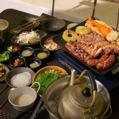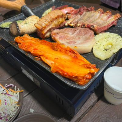 주모세트 2인에 삼겹살추가해서 한 상 나왔는데 등갈비, 소시지까지 삽자루 모양 팬에 캠핑 온 느낌 제대로 입니다.