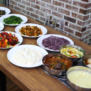 음식이 짜지 않고 맛있어요. 매장도 넓어요. 반찬 가지수 많아요. 국, 죽, 돼지고기, 잔치국수는 늘 준비되어 있는거 같아요. 밥도 흰밥과 흑미밥 2 종류예요.