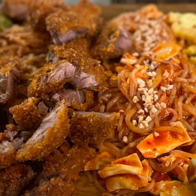 족발튀김은 엄청 바삭바삭하고 맛있어요. 같이 나오는 쫄면과 궁합이 딱맞아요.