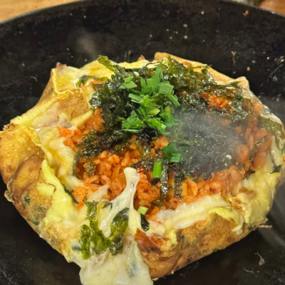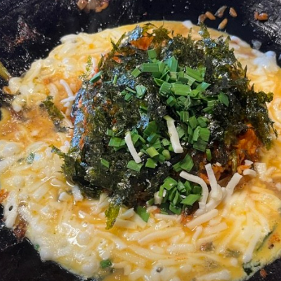 곱창을 먹었던 철판에 볶음밥을 가운데 두고 계란을 두르고 그 위에 모짜렐라 치즈를 듬뿍 맛있어요.
