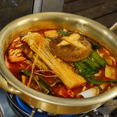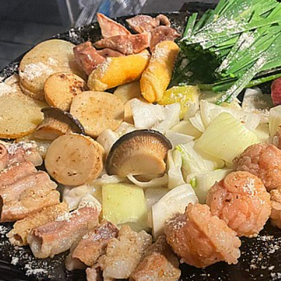 버너 위에 지글지글 끓여서 먹는 곱창 양푼이의 시원하고 매운 맛과 철판 위의 다양한 종류의 곱창 모듬이 너무 잘 어울려요.