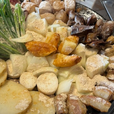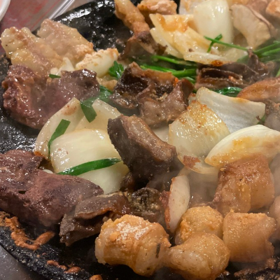 버너 위에 지글지글 끓여서 먹는 곱창 양푼이의 시원하고 매운 맛과 철판 위의 다양한 종류의 곱창 모듬이 너무 잘 어울려요.