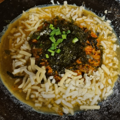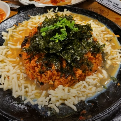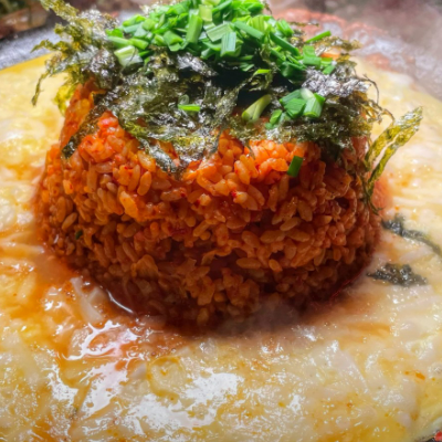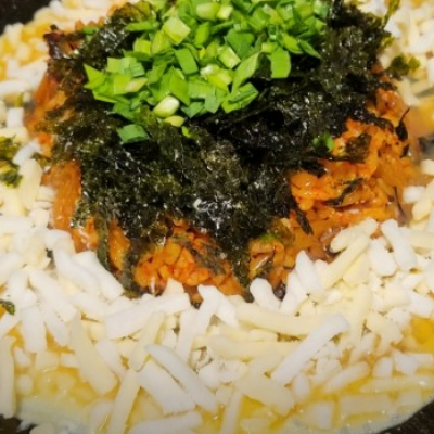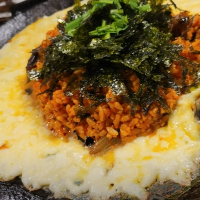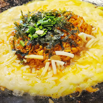 곱창을 먹었던 철판에 볶음밥을 가운데 두고 계란을 두르고 그 위에 모짜렐라 치즈를 듬뿍 맛있어요.
