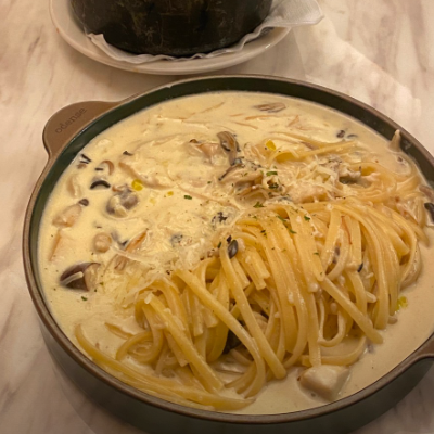 파스타 양도 많고 맛도 있었어요. 곁들여먹는 빵도 맛있어요.