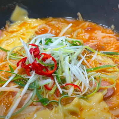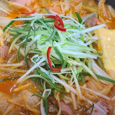 우리가 알고있는 부대찌개와 다른 담백한 맛이예요. 햄도 많이 들어 있어요.