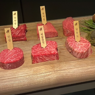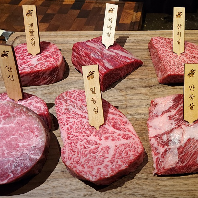 32개월령이상의 미경산 1++올리브한우 암소를 직접 공급받아 한 마리에서 나오는 다양한 부위를 제공하고 있습니다. 준비되는 각 구이용 부위는 매일 달라집니다