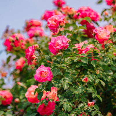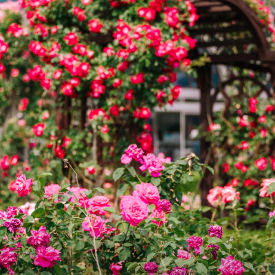 다양한 종류의 장미꽃들이 활짝 피어나며, 아름다운 꽃들을 감상할 수 있는 정원입니다.