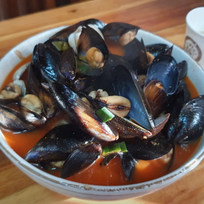 얼큰이국시 속풀리게 시원하네요. 안에 홍합이 가득해요. 그릇 넘칠듯합니다.