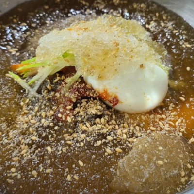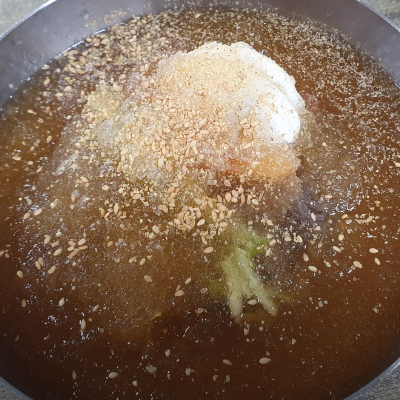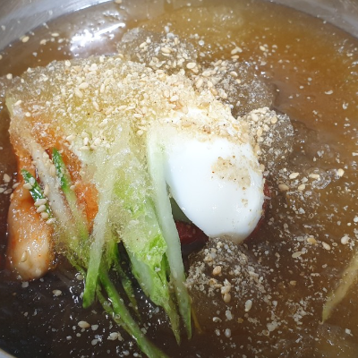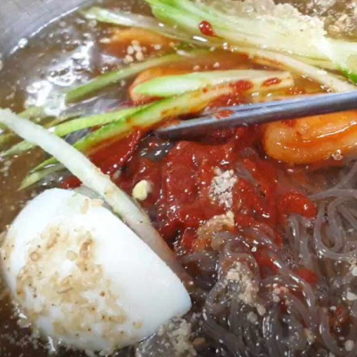 육수가 시원했고 약간의 다데기가 들어가 있는데 비빔냉면의 양념장과 같았어요.