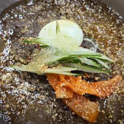 냉면에는 오이, 절인무, 계란 4분의 1개가 고명으로 들어가 있습니다.
